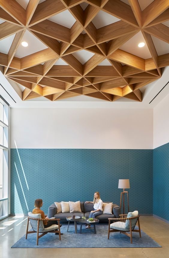 Adding traditional architectural features to a ceiling is a great way to honor the designs of history. This image showcases a geometrical plastered ceiling painted in pearly white over the main hall fall ceiling design. Adding texture to the ceiling makes it much more appealing because it always comes in focus. Each corner of a room should be a focal point, so we like to challenge these rules.