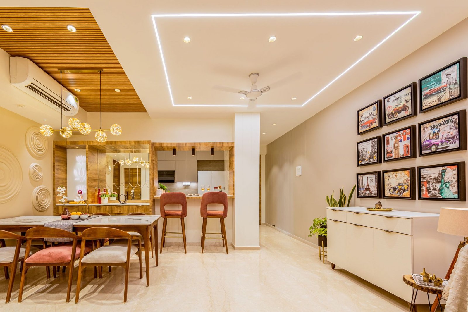 Incorporating gypsum board, wood, and Plaster of Paris, fall ceiling designs for the hall elevate the space and complement paneled walls, neutral furnishings, and hardwood floors.