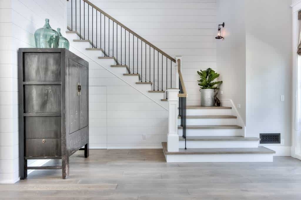 Keep up with the curveball with smart stairs that include tech. With setups like LED light strips built into the stairs and sensors that automatically light up the steps, smart stairs combine functionality and innovation. Such designs not only boosts the aesthetic value but also add to the smart operation of your home. To keep the LED strips out of view from above, place them behind the treads. Such under-the-open riser lighting will create a shadow, giving a great effect. This will also make a dramatic impact on the wall.