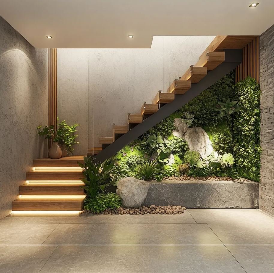 With the staircase design plant, you can use plants and lawn for stairs. You can either include plants on the staircase or vertical grass. Stairs can be decorated to look appealing, and add relaxing elements. Being a natural air purifier, indoor plants such as Bamboo Plants and Aglaonema plants also create a calming environment.