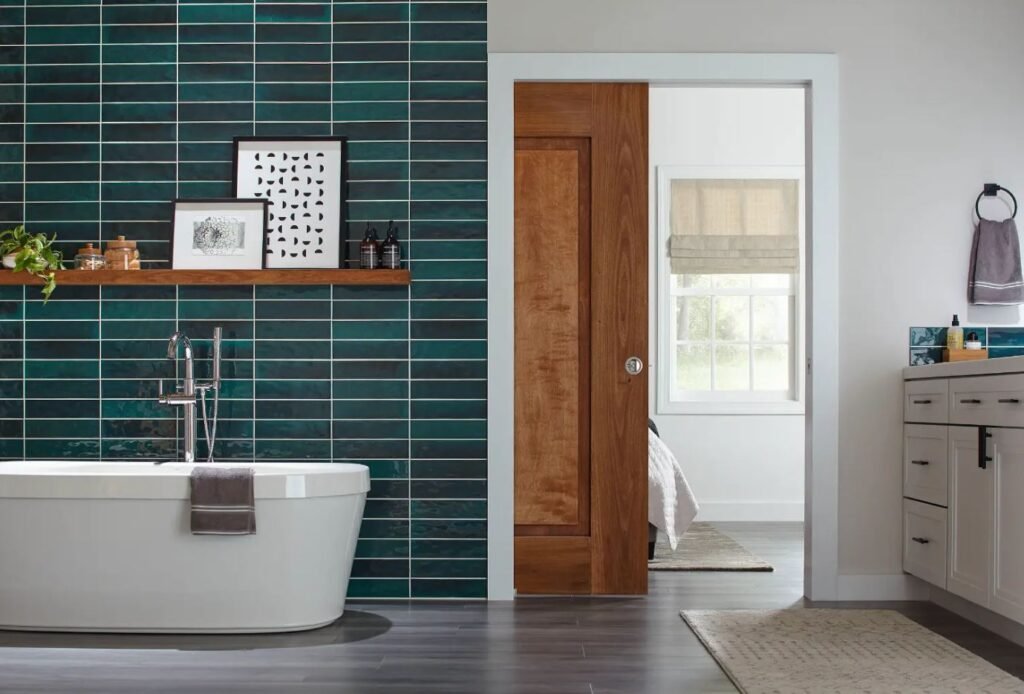 Pocket doors are Perfect for a small bathroom, pocket doors don’t take up much room and act as a space-saving solution. Sliding into the wall cavity, these doors help to de-clutter the room by taking up less floor space, which in turn, helps to create a more open and airy feeling. They are perfect for separating the shower or tub from the rest of the room while preserving both privacy and a glasslike look.