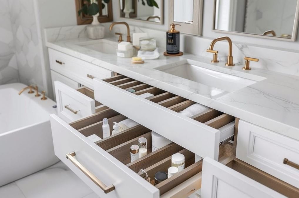 Add vertical storage so you can clear your floor and invest in clear containers for easy visual access. This minimal design will not only cut your bathroom cleaning time in half, but it will also open up your tiny bathroom space and allow you to enjoy a calm, clutter-free zone daily.